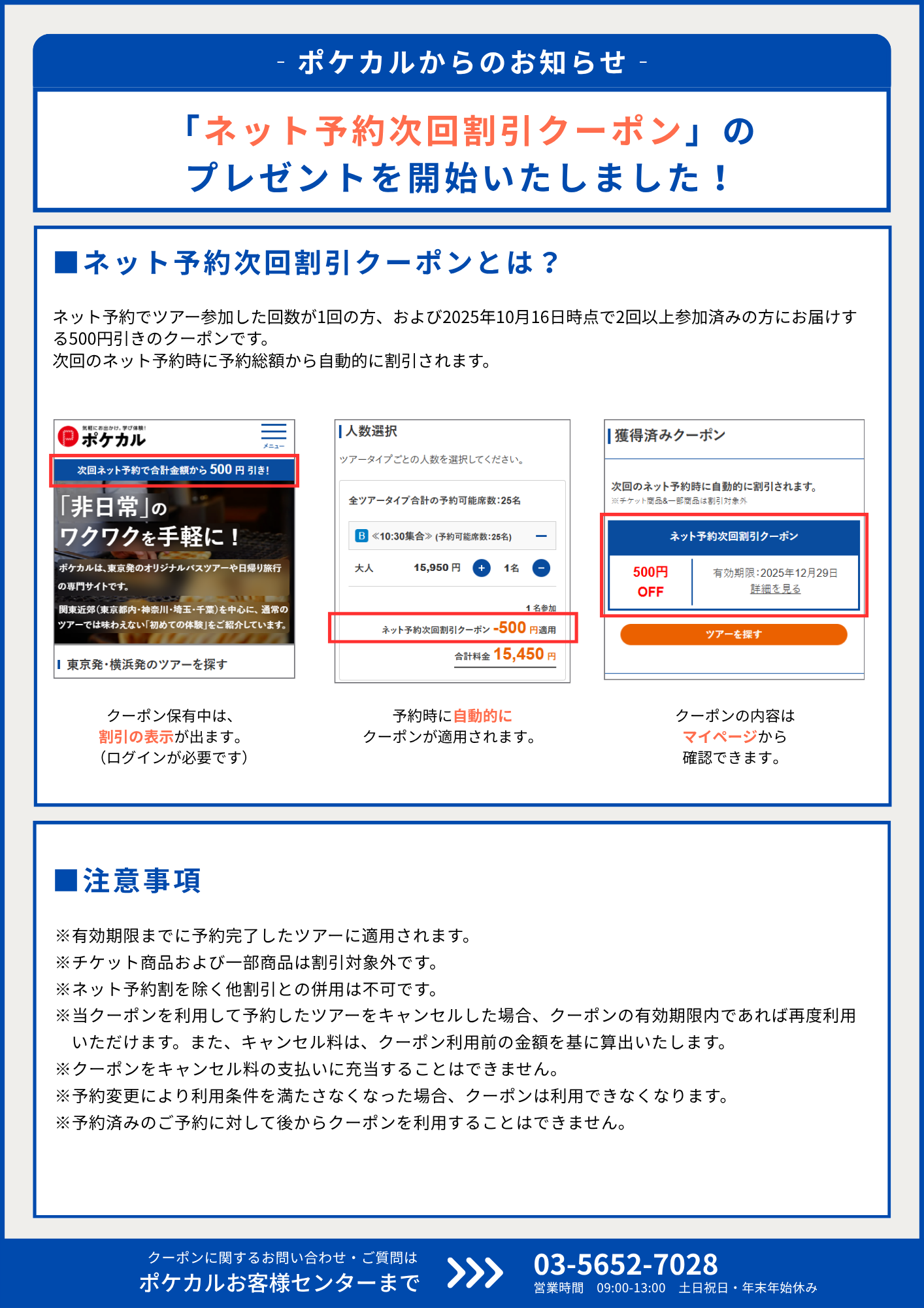 ネット予約でツアー参加した回数が1回の方、および2025年10月16日時点で2回以上参加済みの方にお届けする500円引きのクーポンです。